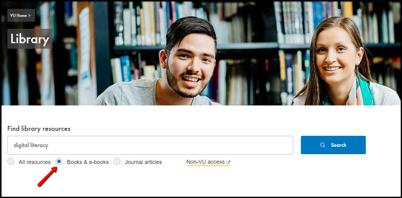 Search for e-books on VU’s library website by typing in a title, author or simply by entering keywords in the Find Library Resources box and selecting the "Books & e-books" option.
