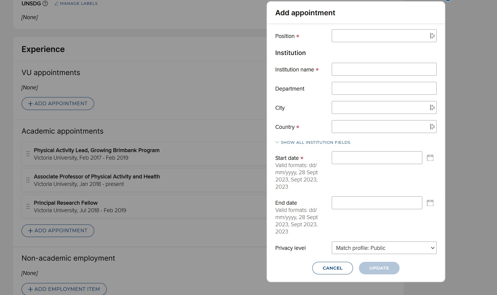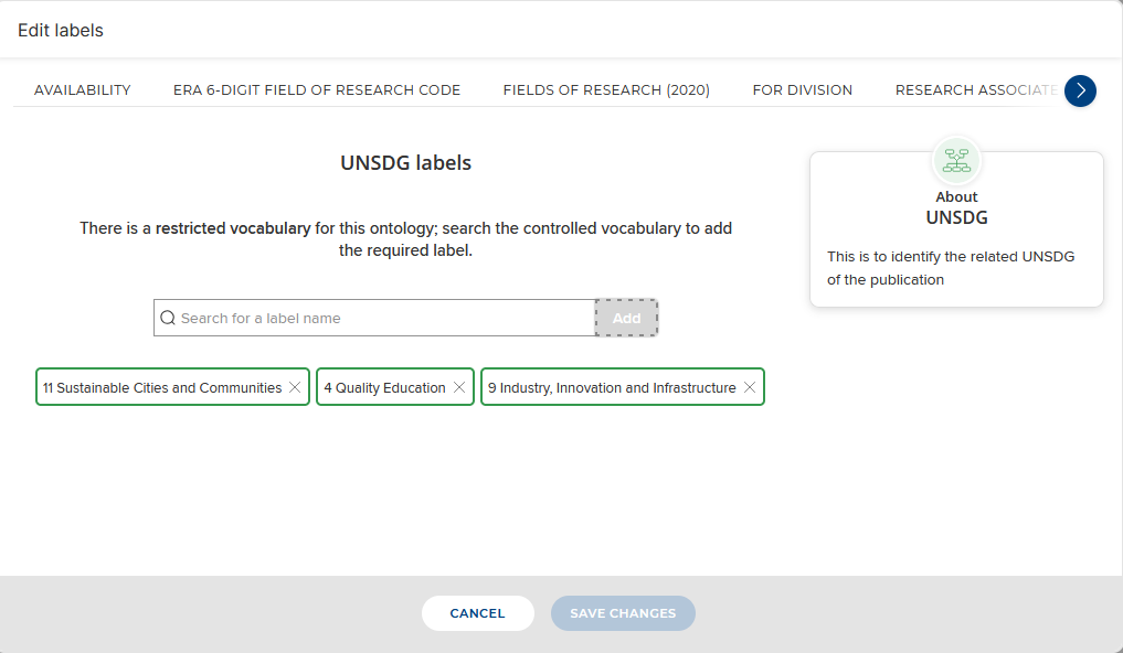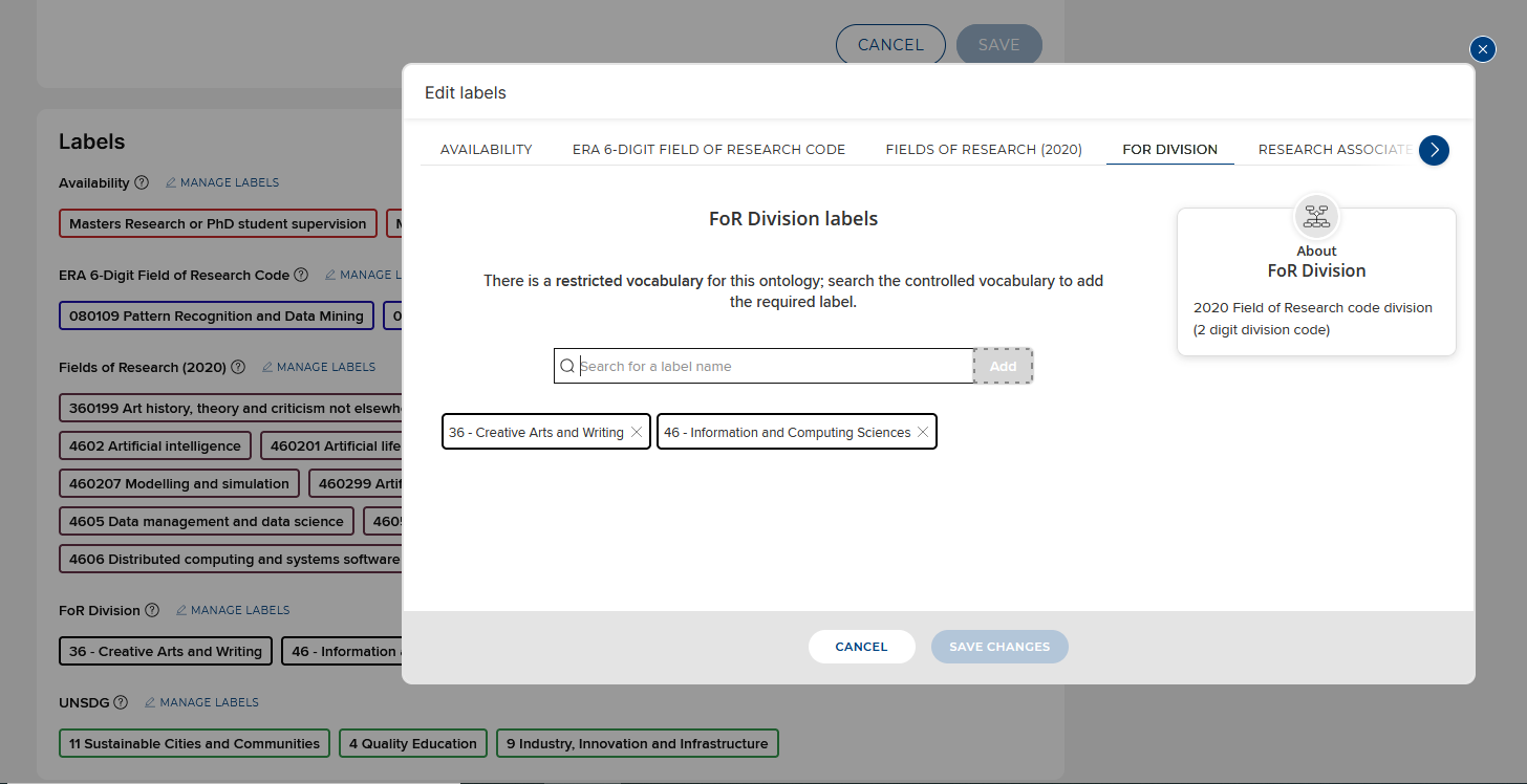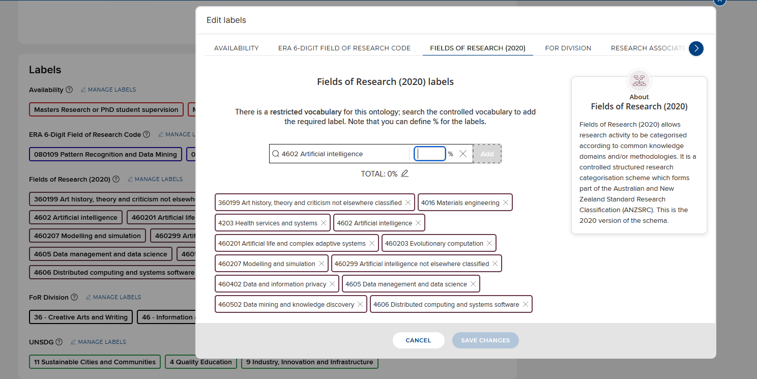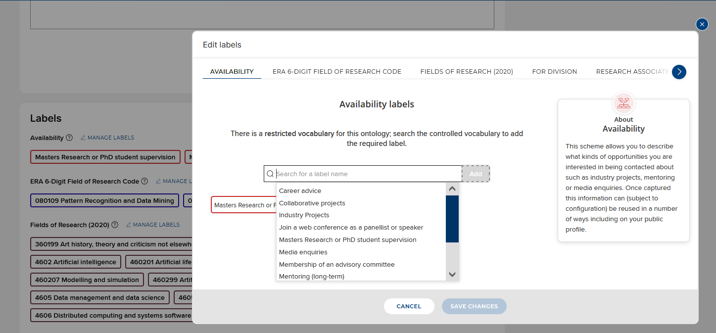 The Labels field allows you to apply various labels to your profile. These are: Availability; Field of Research Codes (FoRs) and United Nations Sustainable Development Goals (UNSDGs). To add content click on 'Manage Labels' on relevant sections.