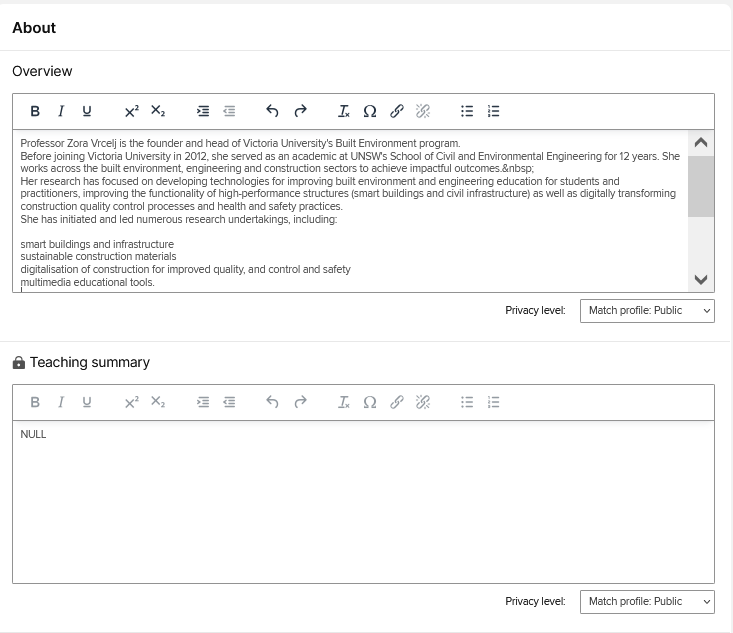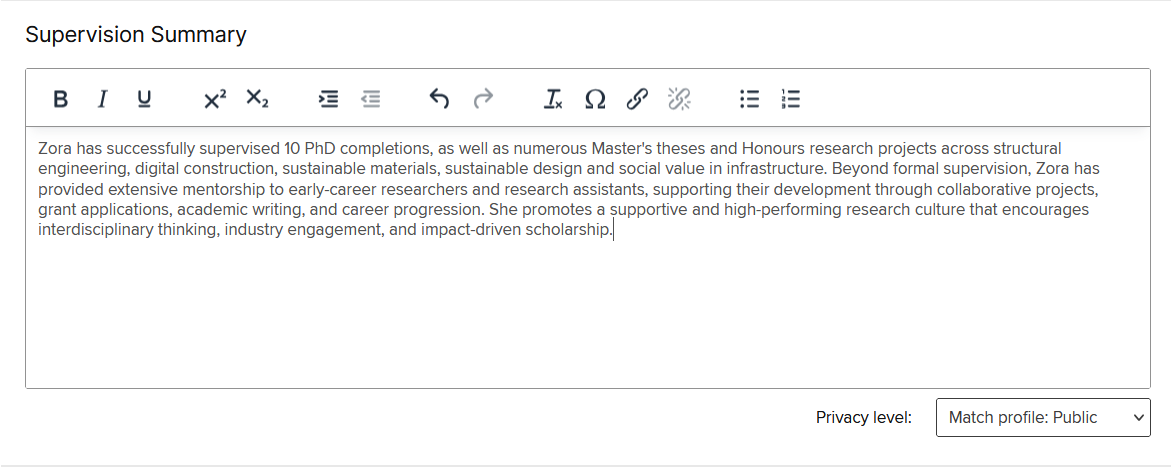 There are four summary fields: Research Outputs; Funded Research; Service & Outreach; and Supervision. You only need to put content in the summary fields relevant to you. These fields allow free text with HTML being optional.