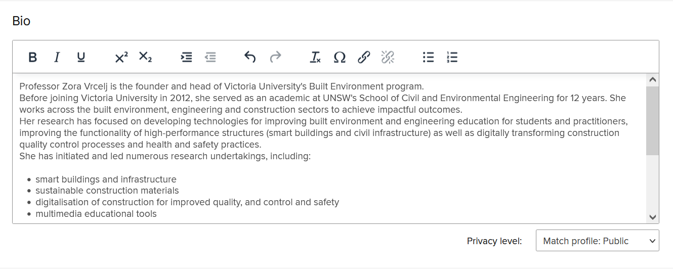 Please update and edit your Bio if it has been it has been migrated across from the previous profile system. If you haven't had a profile before you will need to create a bio. See below for of an example of the type of information to include in your Bio.